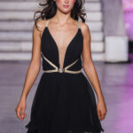 Asymmetrical mini crepe dress with built-in bust support, gold decorative metal detail, and crisscross back