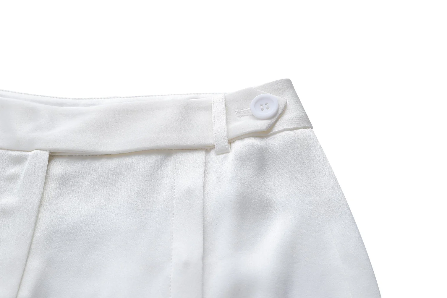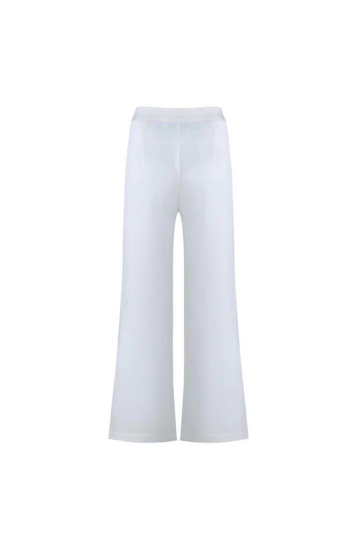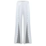 The bold side slit is accentuated by hand-sewn button detailing, giving each piece a couture finish. Lightweight yet structured, the trousers offer both elegance and versatility — perfect for eveningwear or elevated day outfits.