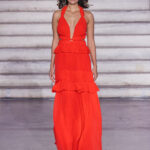 Maxi ruffled dress with halter neckline, airy skirt, deep V-neck and built-in bra