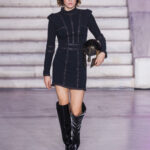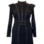 Elegant Mini Dress with Covered Neckline, Shoulder Pads, and Stud Embellishments