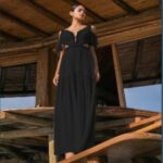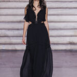 Maxi chiffon dress with gold decorative trim, bustier bodice with V neckline and off-theshoulder design